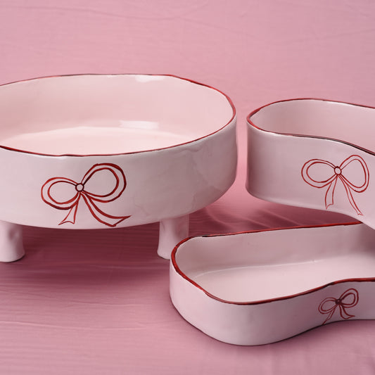 Ceramic Elevated Round Bowl with Bow- Pink and Red