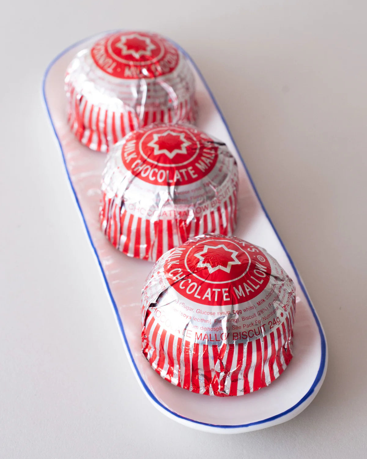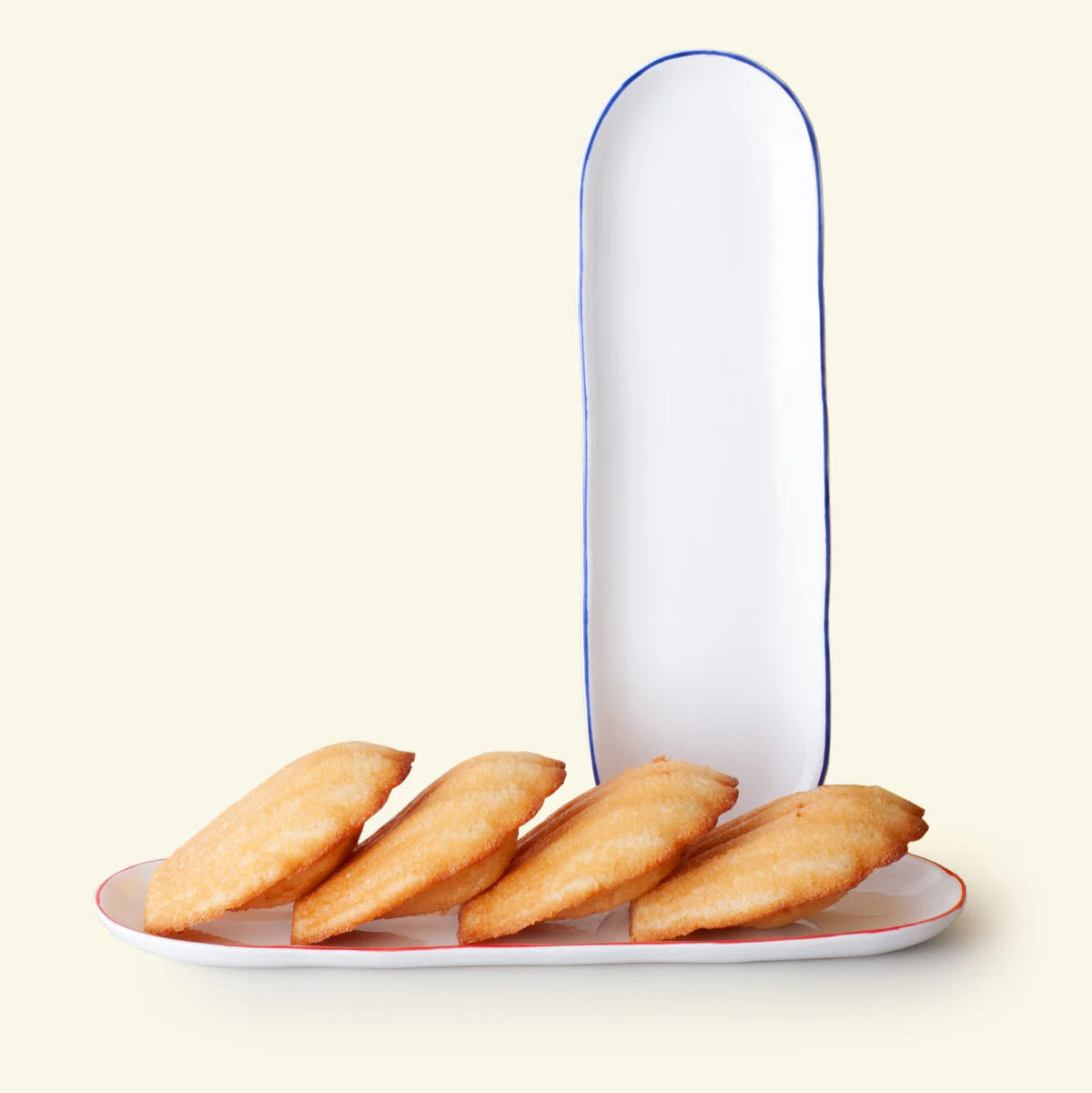A small oblong serving platter with dimpled shallow sides, for presenting food to share be it charcuterie or cherries.