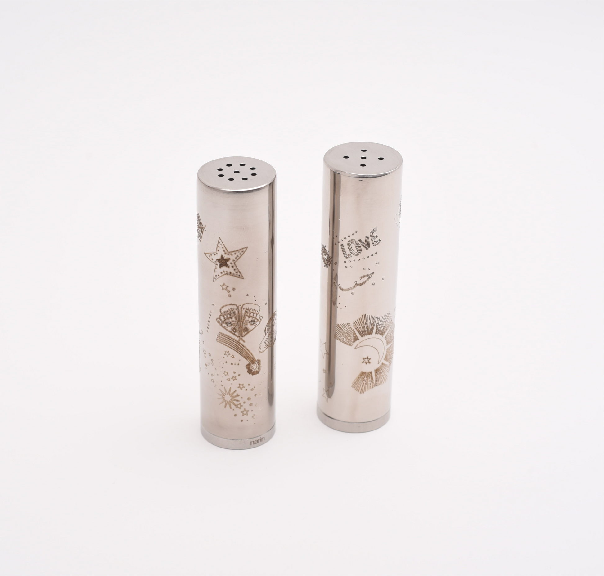 Sleek stainless steel salt and pepper shakers featuring delicate engraved details. Designed in a modern cylindrical shape, they add an elegant finishing touch to both everyday dining and special tablescapes. Functional, timeless, and perfect for gifting.